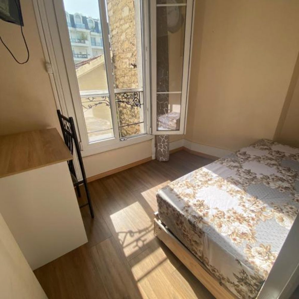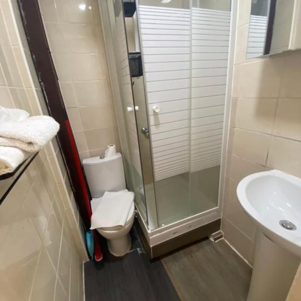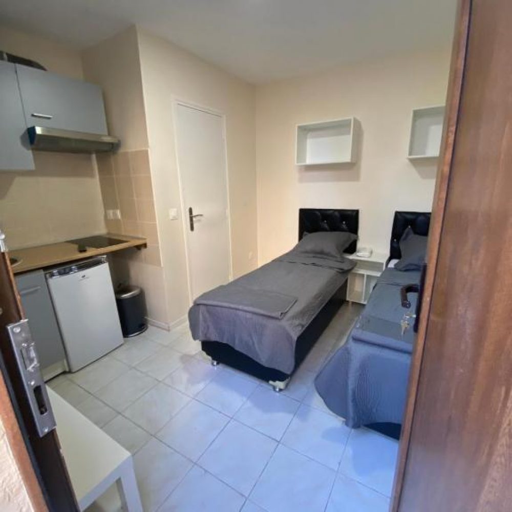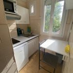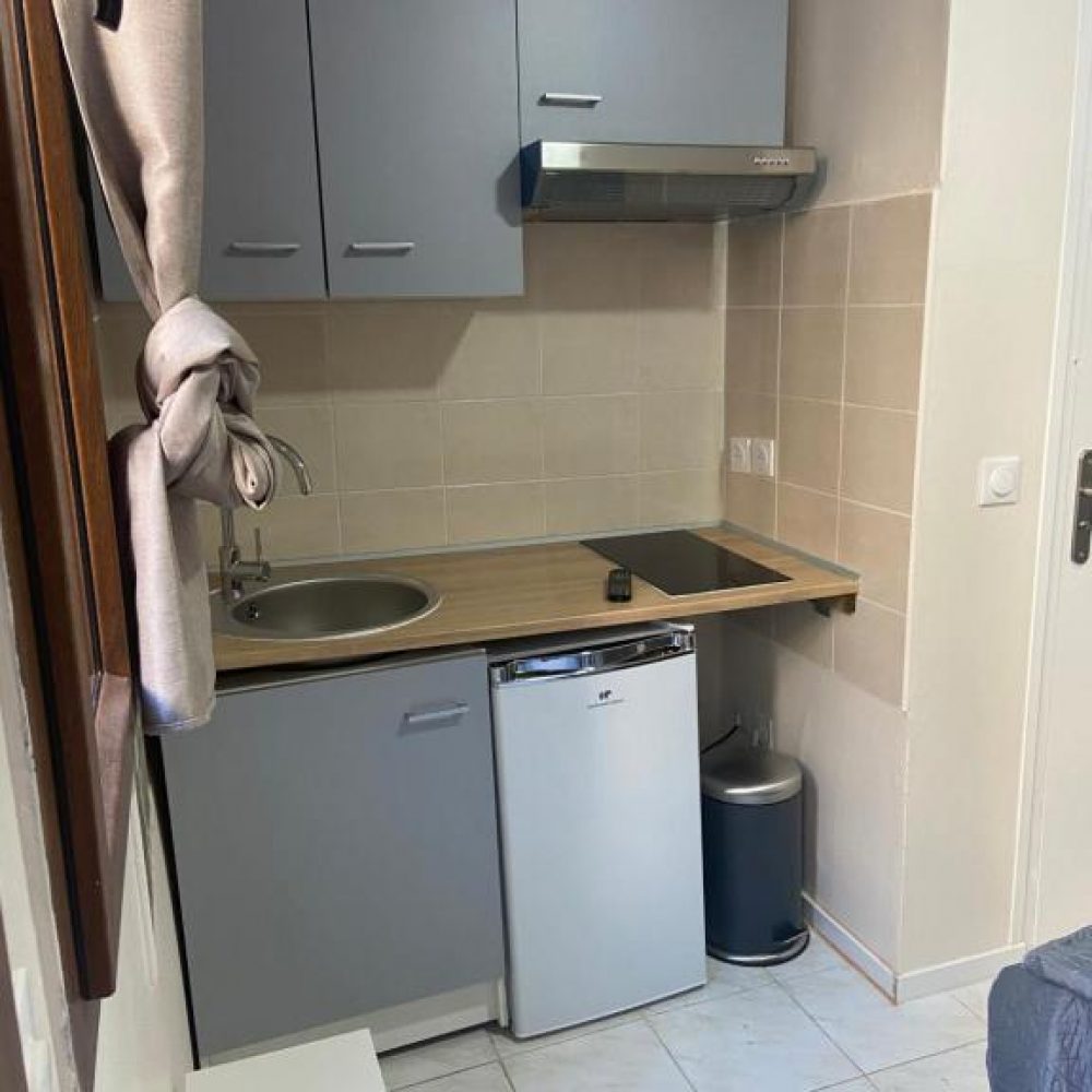 Petite chambre bien équipée, Cuisine privative, Salle de bains privative, Vue sur une cour intérieure, Logement situé au rez-de-chaussée.